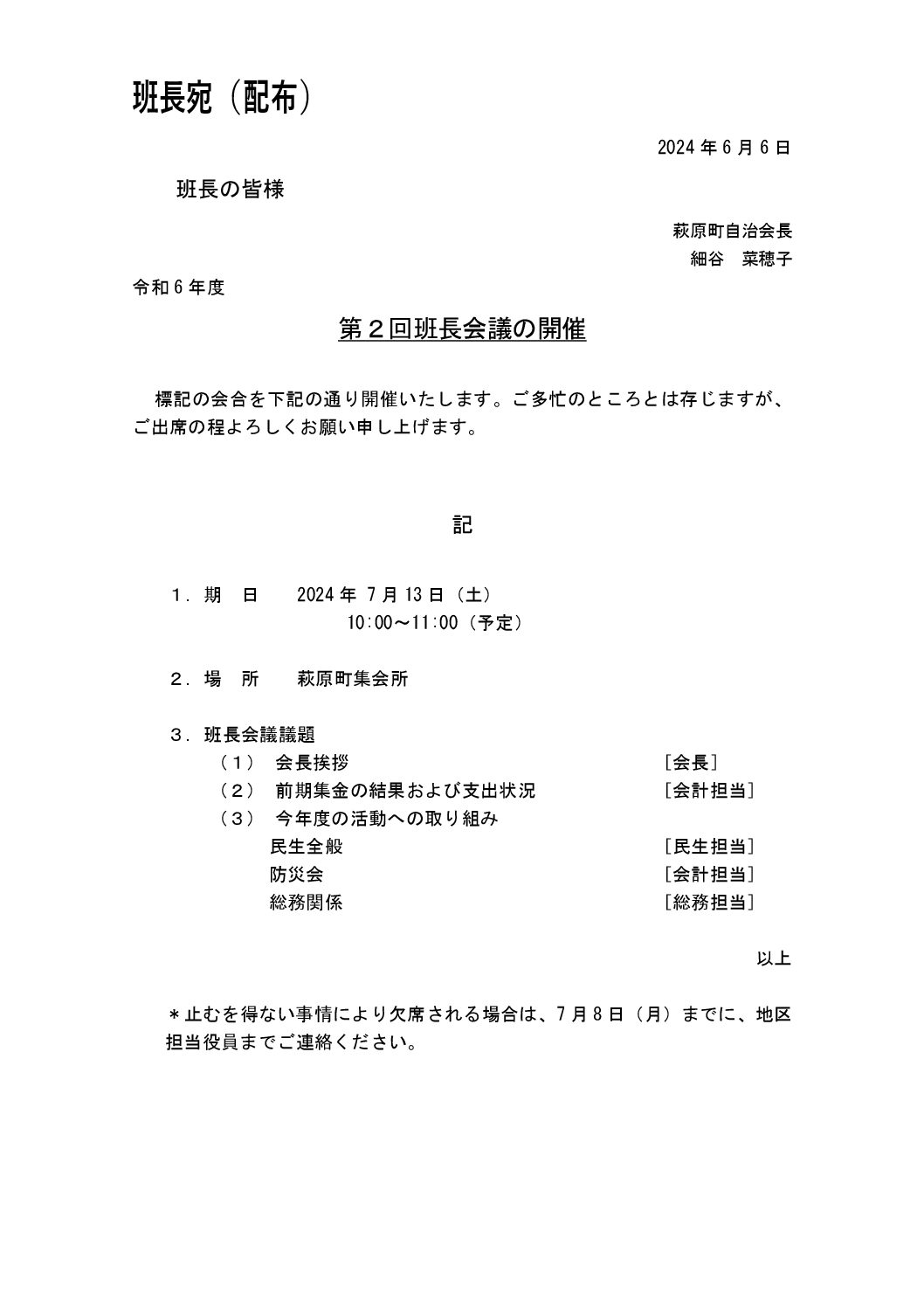 本件つきまして何か問題が生じた場合やご意見等ございましたら自治会役員までご連絡頂きたくお願い致します。